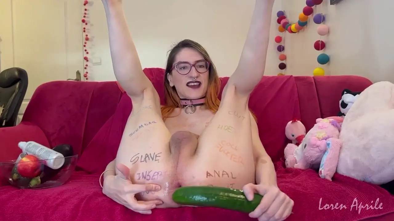 Loren Aprile, the trans whore, takes a huge cucumber and slowly works it into her tight asshole. She moans as the thick object expands her, making her hole gape. She takes it all in until he cums inside her, filling her ass with his sticky load.